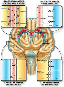 Selon une étude menée en Suède[13], les péricytes joueraient un rôle essentiel dans la régulation de l’étanchéité de la barrière hémato-encéphalique (BHE). Ils vont soit l’ouvrir et laisser passer des molécules de différentes tailles qui n’affectent pas le cerveau, soit la fermer pour empêcher le passage de toutes molécules pouvant induire des lésions au cerveau. De plus, les péricytes régulent le fonctionnement des astrocytes, qui soutiennent la BHE grâce à des extensions appelées podocytes. Ces extensions enveloppent les capillaires et règlent la circulation de l’eau et des ions.