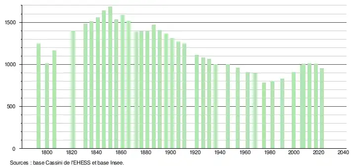 L'évolution du nombre d'habitants est connue à travers les recensements de la population effectués dans la commune depuis 1793. Pour les communes de moins de 10 000 habitants, une enquête de recensement portant sur toute la population est réalisée tous les cinq ans, les populations de référence des années intermédiaires étant quant à elles estimées par interpolation ou extrapolation[20]. Pour la commune, le premier recensement exhaustif entrant dans le cadre du nouveau dispositif a été réalisé en 2007[21].