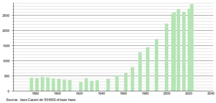 L'évolution du nombre d'habitants est connue à travers les recensements de la population effectués dans la commune depuis 1876. Pour les communes de moins de 10 000 habitants, une enquête de recensement portant sur toute la population est réalisée tous les cinq ans, les populations de référence des années intermédiaires étant quant à elles estimées par interpolation ou extrapolation[31]. Pour la commune, le premier recensement exhaustif entrant dans le cadre du nouveau dispositif a été réalisé en 2005[32].