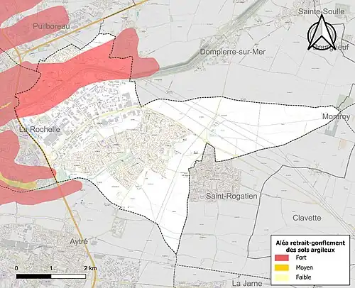 Le retrait-gonflement des sols argileux est susceptible d'engendrer des dommages importants aux bâtiments en cas d’alternance de périodes de sécheresse et de pluie. 14,4 % de la superficie communale est en aléa moyen ou fort (54,2 % au niveau départemental et 48,5 % au niveau national). Sur les 3 158 bâtiments dénombrés sur la commune en 2019, 695 sont en aléa moyen ou fort, soit 22 %, à comparer aux 57 % au niveau départemental et 54 % au niveau national. Une cartographie de l'exposition du territoire national au retrait gonflement des sols argileux est disponible sur le site du BRGM[13],[Carte 2].