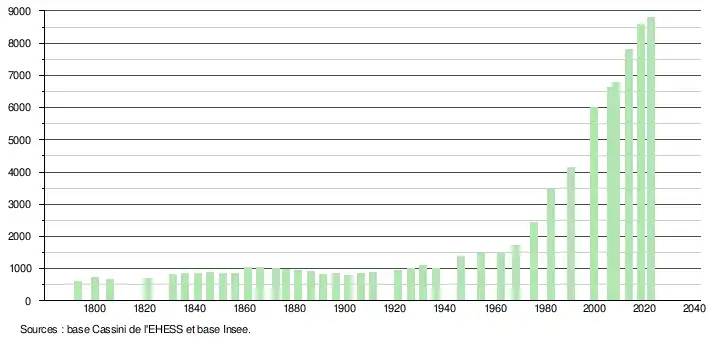 L'évolution du nombre d'habitants est connue à travers les recensements de la population effectués dans la commune depuis 1793. Pour les communes de moins de 10 000 habitants, une enquête de recensement portant sur toute la population est réalisée tous les cinq ans, les populations de référence des années intermédiaires étant quant à elles estimées par interpolation ou extrapolation[17]. Pour la commune, le premier recensement exhaustif entrant dans le cadre du nouveau dispositif a été réalisé en 2008[18].