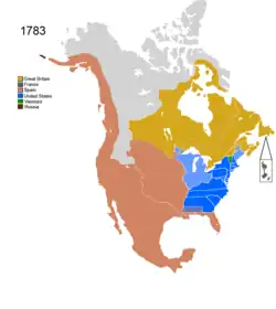 Après la victoire américaine à la bataille de Yorktown en septembre 1781 et l'effondrement du ministère du premier ministre britannique Frederick North en mars 1782, les deux parties cherchent un accord de paix[11]. La guerre d'indépendance américaine prend fin avec la signature du traité de Paris de 1783, qui accorde aux États-Unis l'indépendance ainsi que le contrôle d'une vaste région au sud des Grands Lacs, s'étendant des Appalaches à l'ouest jusqu'au fleuve Mississippi. Bien que le Parlement britannique ait rattaché cette région transappalachienne à la Province de Québec en 1774 dans le cadre de l'Acte de Québec, plusieurs États ont des revendications territoriales dans la région fondées sur des proclamations et des chartes royales, qui définissent leurs frontières comme s'étendant « d'une mer à l'autre »[12]. Certains Américains ont espéré que le traité prévoirait l'acquisition de la Floride espagnole, mais ce territoire est restitué à l'Espagne, qui a rejoint les États-Unis et la France dans la guerre contre la Grande-Bretagne et réclame son dû[13]. Les Britanniques se sont battus avec acharnement et succès pour conserver le Canada, ce que le traité reconnaît[14] .