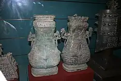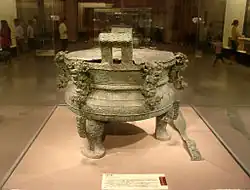 Le culte des ancêtres est un élément majeur de la religion de la période des Printemps et Automnes, marqué par les traditions mises en place à la cour royale des Zhou, notamment à la suite d'une « réforme » rituelle au IXe siècle. Il a lieu dans des temples, où se déroulent à diverses occasions des sacrifices mais aussi d'autres cérémonies à caractère politique[97]. C'est là qu'est préservé le mobilier cultuel, qui a été mis au jour dans les tombes où il accompagne les grands personnages. Il s'agit avant tout de vases destinés à différents actes sacrificiels, les formes indiquant une fonction. Suivant la typologie héritée des « archéologues » de la dynastie Song qui ont étudié ces objets anciens, on distingue les vases destinés à la cuisson de la viande des animaux sacrifiés (tripodes ding et li), des céréales (coupes dui et du, vase gui), à la présentation des mets (vases fermés fu), aux boissons fermentées à base de céréales (bassins jian servent à les chauffer, jarres fanghu), et aux ablutions d'eau (saucière yi, bassins pan)[98]. Parmi les instruments utilisés, les cloches sont bien connues par plusieurs trouvailles archéologiques.