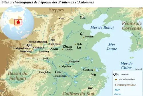 Les États de la période des Printemps et Automnes sont organisés autour d'une ville-centre (guo, ou cheng) qui donne généralement son nom à l'entité politique (elle aussi désignée par le terme guo)[60]. Ils ont d'ailleurs pu être caractérisés de « cités-États ». Le reste du territoire est désigné comme « champ » (ye). Le peuplement est en général discontinu, laissant des hameaux isolés et des zones non mises en valeur, en particulier aux marges des principautés[61]. Les quelques villes de cette période qui ont été dégagées au cours de fouilles archéologiques sont entourées de fortifications en terre damée, et comprennent une partie officielle abritant le palais du dirigeant, qui semble souvent entourée de sa propre muraille et surélevée sur une terrasse, suivant une formule qui est consacrée à la période des Royaumes combattants. La dernière capitale de Jin, Xintian (aujourd'hui Houma), est ainsi organisée autour de quatre enceintes rectangulaires accolées, une disposant d'une grande terrasse qui devait supporter la résidence du souverain et les autres étant sans doute des dépendances d'autres membres de la famille régnante, tandis que d'autres espaces entourés de murailles étaient bâtis plus loin, dont la fonction est mal déterminée (résidentielle, administrative, rituelle ou militaire). Des espaces artisanaux (notamment les fonderies) ont été mis au jour dans la périphérie du site, ainsi que des espaces rituels, funéraires et sacrificiels plus à l'est (notamment le lieu de trouvaille des textes de serments). L'habitat populaire devait également s'étendre hors des enceintes. Les villes comprennent ainsi des zones résidentielles et des espaces artisanaux gravitant autour du pouvoir local. Certaines cités couvrent de vastes espaces : Yongcheng, la capitale de Qin, a ainsi une enceinte grossièrement quadrangulaire mesurant 3 330 mètres dans le sens est-ouest et 3 200 mètres dans le sens nord-sud[62].