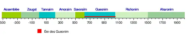 Elle s'étend sur environ 500 ans, au cours desquels l'autorité spirituelle sur l'ensemble des communautés juives est détenue principalement par les académies talmudiques en Babylonie, et accessoirement par l'académie de la terre d'Israël, dont les doyens sont appelés les Gueonim.