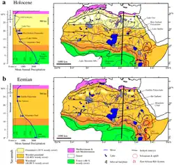 La période humide africaine (PHA) a lieu à la fin du Pléistocène[36] et au début de l'Holocène moyen[37] et voit une augmentation des précipitations en Afrique du Nord et de l'Ouest en raison d'une migration vers le nord de la ceinture pluviale tropicale[19]. La PHA est le changement climatique le plus profond des basses latitudes au cours des 100 000 dernières années[38] et se distingue au sein de l'Holocène par ailleurs relativement stable sur le plan climatique[39]. Il fait partie de ce que l'on appelle l'optimum climatique de l'Holocène, au cours duquel les étés dans l'hémisphère nord étaient plus chauds qu'aujourd'hui[40]. Liu et al (2007 [41]) subdivise la période humide en «PHA I» ayant duré jusqu'à il y a 8 000 ans, et «PHA II» à partir de 8 000 ans[42], la première étant plus humide que la seconde.