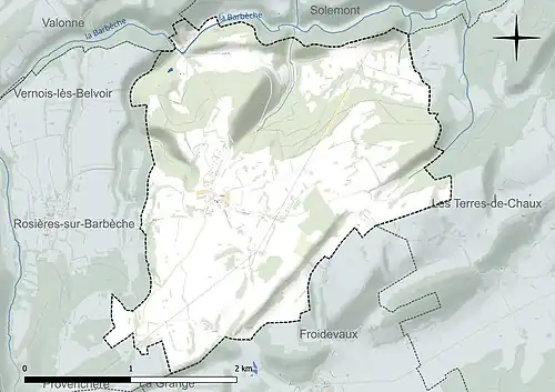 Les communes limitrophes sont Froidevaux, Les Terres-de-Chaux, Rosières-sur-Barbèche, Solemont et Valonne.