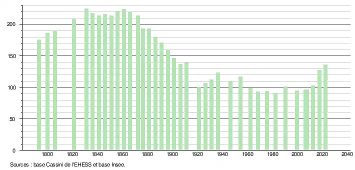 L'évolution du nombre d'habitants est connue à travers les recensements de la population effectués dans la commune depuis 1793. Pour les communes de moins de 10 000 habitants, une enquête de recensement portant sur toute la population est réalisée tous les cinq ans, les populations de référence des années intermédiaires étant quant à elles estimées par interpolation ou extrapolation[18]. Pour la commune, le premier recensement exhaustif entrant dans le cadre du nouveau dispositif a été réalisé en 2007[19].