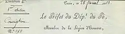 - ↑ Décret signé de l'administrateur général du Piémont, le général Jean-Baptiste Jourdan.