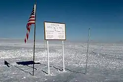 L'emplacement du pôle Sud géographique est indiqué par un petit panneau et un pieu dans la glace, repositionnés chaque année au nouvel an pour compenser la dérive glaciaire. Le panneau porte mention des dates d'arrivée au pôle de Roald Amundsen et Robert Scott, ainsi que l'altitude de 2 835 m[3]. Non loin de là se tient une zone appelée le « pôle Sud de cérémonie », créée pour répondre aux besoins photographiques éventuels. Elle consiste en une sphère métallique placée sur un socle et entourée des drapeaux des pays signataires du traité sur l'Antarctique. Ce marqueur cérémoniel est déplacé tous les deux ou trois ans afin de conserver une distance de marche minimale avec le pôle Sud géographique.