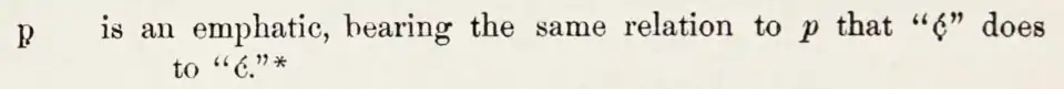 Dans les années 1890, Stephen Return Riggs utilise le p point souscrit dans son orthographe lakota[2].