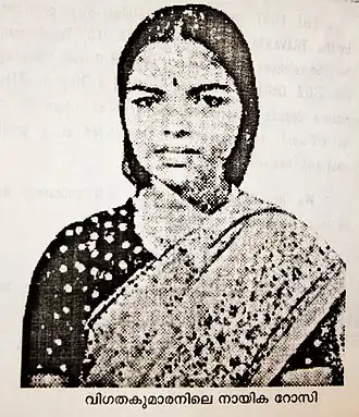 La troupe de théâtre Kakkarasi et la troupe de théâtre Rajah Party Drama se disputent les services de Rosamma. Cette compétition rehausse la valeur de star de l'actrice. C'est ainsi qu'elle devient l'héroïne du film muet de JC Daniel après que l'actrice initialement choisie se soit révélée inadaptée pour le rôle[4]. Elle interprète le personnage de Sarojini, une femme Nair, dans le film[12]. La production du film commence en 1928. Le 23 octobre 1930 lorsque Vigathukumaran sort dans les théâtres[13], les membres de la communauté Nair sont furieux de voir une femme Dalit incarner une Nair. De nombreux membres éminents de l'industrie cinématographique de l'époque refusent de venir inaugurer l'ouverture de Vigathakumaran si Rosy s'y trouve physiquement présente, y compris le célèbre avocat Madhoor Govindan Pillai. À la suite d'une scène où le personnage principal embrasse une fleur dans ses cheveux, le public jette des pierres sur l'écran. Le réalisateur, Daniel, ne l'invite lui-même pas à l'ouverture au Capitol Theatre de Thiruvananthapuram, craignant des représailles, mais Rosy y assiste malgré tout, mais tout de même contrainte de regarder une deuxième projection par ceux qui boycottent l'événement. Le public se transforme en une foule en colère qui détruit l'écran et endommage le théâtre[14]. Finalement, Rosy doit s'enfuir[15].