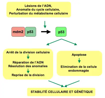 La fonction première de la protéine p53 est d’agir en tant que facteur de transcription. Elle fonctionne en se fixant de manière spécifique sur les régions régulatrices de gènes dont elle contrôle l’expression. Dans une cellule normale, en l’absence de tout stress, il n’y a que très peu de p53, car celle-ci n’est pas nécessaire au fonctionnement de la cellule. Cette absence de p53 est due à l'enzyme mdm2, une E3 ubiquitine ligase qui, en se fixant sur p53, induit sa destruction. Lorsque la cellule se trouve en situation de stress, l’association entre p53 et mdm2 est abolie ce qui conduit à une augmentation de la quantité de p53 dans la cellule. Cette première phase est nommée « phase d’activation ». De nombreux types de stress sont capables d’activer la p53 comme les lésions de l’ADN, les défauts de division ou de métabolisme cellulaire.