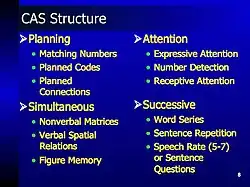 La théorie PASS fournit le cadre théorique d'un instrument de mesure appelé le Das–Naglieri cognitive assessment system (CAS) (en), publié en 1997[5]. Ce test est conçu pour fournir une évaluation nuancée du fonctionnement intellectuel, fournissant des informations sur les points forts et les points faibles de chacun des quatre processus cognitifs. Cet accent mis sur les processus cognitifs est utile dans le cadre d'un diagnostic différentiel. Le CAS aide au diagnostic des troubles d'apprentissage, des troubles de l'attention (ADD), de l'autisme, du retard mental, des modifications cognitives dues au vieillissement ou au syndrome de Down, et, aux changements cognitifs résultant d'un accident vasculaire cérébral[6]. Son utilité en tant que théorie et instrument de mesure pour la planification et la prise de décision en management a également été suggérée.[réf. nécessaire]