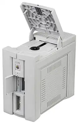 | Face arriére de la PC-FX, avec les ports S-Video et vidéo composite | PC-FX avec le lecteur de disque ouvert | Base |