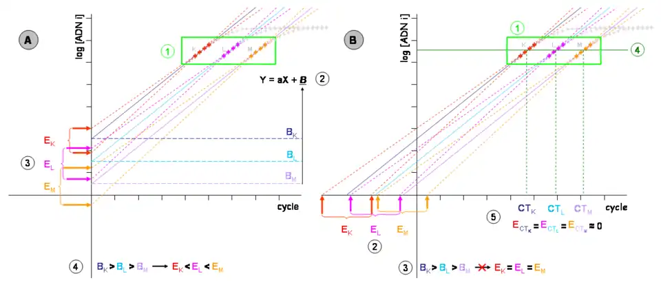 - B est un point mathématique qui n’a aucune réalité expérimentale (log 0 = 1/∞). Il peut néanmoins être utilisé pour calibrer les expériences de PCR (souvent nommée « run ») entre elles. Si les différentes gammes avaient été calibrées par leur intercept à l'origine (B), la dispersion serait apparue comme beaucoup plus faible, sauf pour les points M et N.