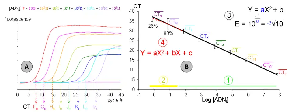 Le principe de la PCR en temps réel repose sur la possibilité de suivre la quantité d'ADN présente dans la réaction à tout instant et non à la fin de la PCR (PCR point final) ou au cycle n < 40 (PCR semi-quantitative). Des sondes fluorescentes se fixent soit sur l'ADN double brin (technologie SYBR) ou sur une séquence d'ADN précise (technologie Taqman[3] et Beacon). Ces sondes ne sont fluorescentes qu'une fois fixées à l'ADN (soit à cause d'un « quencher » soit car la fluorescence nécessite un ADN double brin). Un seuil de fluorescence est établi par le programme de l'appareil de PCR en temps réel. Une fois que la quantité d'ADN permet aux sondes fluorescentes de dépasser ce seuil alors on obtient un numéro de cycle PCR appelé « Ct » pour « Cycle Threshold » soit « cycle seuil ». C'est cette valeur qui est à la base des calculs pour quantifier l'ADN de façon absolue ou relative. Il est important de connaître l'efficacité E de la PCR. Pour cela, on effectue une PCR en temps réel sur des échantillons de dilution croissante pour obtenir une courbe étalon correspondant au couple d'amorces utilisé (spécifiques du locus d'intérêt). Par exemple, une série de dilution au ½ () doit, en théorie, donner des courbes d'amplification décalées d'un cycle PCR à chaque fois. Si tel est le cas, la réaction a alors une efficacité égale à 2 (la quantité d'ADN double à chaque cycle). En pratique, le programme de la machine de PCR en temps réel peut calculer l'efficacité E de la réaction. Plus souvent, une PCR en temps réel sur une série de dilution avec une quantité d'ADN initiale connue permet de calculer l'efficacité de la réaction. Les Ct sont placées sur un graphe en échelle logarithmique et l'équation de la régression linéaire passant par ces points donne l'efficacité (c'est le coefficient directeur).