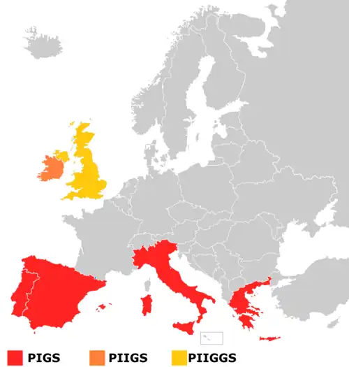 Parfois, l'Irlande est incluse dans le lot, ce qui donne PIIGS[3]. Cependant, « I » dans PIGS désigne habituellement l'Italie[4],[5]. Selon Eric Nielsen, économiste en chef pour l'UE chez Goldman Sachs, « L'Italie est dans une position plus agréable que les autres pays du sud de l'Europe grâce à une meilleure balance commerciale[6] ».