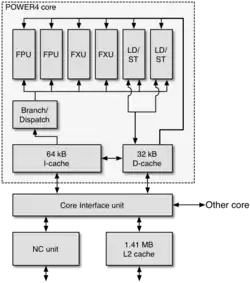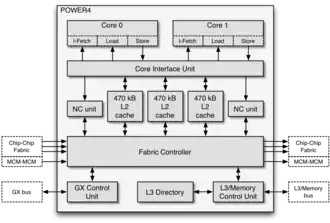 L'unité interne du POWER4 consiste en deux implémentations de l'architecture PowerPC-AS. Le POWER4 a deux caches de niveau 2 unifiés, divisés en trois parties égales. Chacun d'eux à son propre contrôleur de cache de niveau 2 indépendant qui peut chercher 32 octets de données par cycle. La Core Interface Unit (CIU, unité d'interface principale), connecte chaque contrôleur de cache au cache de données ou au cache d'instructions des deux processeurs. L'unité Non-Cacheable (NC), s'occupe de la gestion de la sérialisation des instructions et de toutes les opérations qui ne sont pas cachables dans la topologie des enregistrements. Il y a un contrôleur de cache de niveau 3, mais il est situé en fait en dehors de la puce. Le contrôleur de bus GX pilote les entrées/sorties, les communications, et les deux bus GX 32bits, un en entrée et l'autre en sortie. Le Fabric Controller est le contrôleur principal du réseau de bus, des communications entre les contrôleurs de caches, des communications entre les puces POWER4, et des modules de POWER. Le processeur contient aussi le nécessaire au débogage (Built In Self Test function, BIST) et à la mesure de performances avec la Performance Monitoring Unit (PMU). Le Power-on reset est aussi supporté.