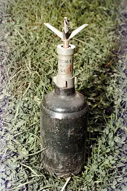 Le corps de la mine est attaché à sa base par une courte longueur de fil, qui se déroule derrière elle au fur et à mesure qu’elle s’élève. Lorsque la mine atteint une hauteur d’environ 65 centimètres, le fil est tiré. Cela secoue l’ensemble du détonateur vers le bas dans le percuteur. Le détonateur se déclenche, déclenchant la charge explosive principale, qui brise le corps rainuré à l’intérieur en un grand nombre de fragments d’acier, qui sont propulsés à grande vitesse dans toutes les directions. Le temps écoulé entre le déclenchement de la mine et la détonation (généralement une seconde) est trop court pour se mettre à l’abri de l’explosion.
