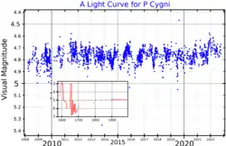 P Cygni montre des signes de fortes éruptions survenues par le passé, il y a environ 900, 2100 et peut-être 20 000 ans. Dans les derniers siècles, elle a très lentement accru sa magnitude visuelle et décru en température, ce qui a été interprété comme la tendance évolutive attendue pour une étoile massive vers un stade de supergéante rouge[15].