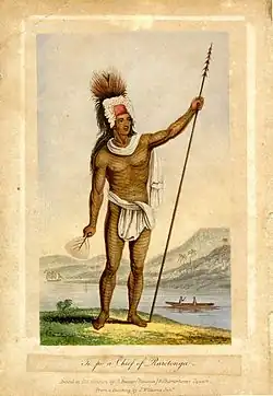 - ↑ Selon Frederick Joseph Moss, il s'agirait en réalite de Te Pou Makea de la lignée des Makea Vakatini Ariki. "Le 19 août 1893, décédait Mana-Rangi, chef de la branche Vakatini de la famille Makea. Il était le fils de Te-Pou, dont le portrait constitue la page de garde de l'ouvrage de John Williams "Missionary Enterprise" ("The Maori Polity in the Island of Rarotonga" by Fredrerick J Moss, JPS, 1894 Volume 3, No.1. p.21). Cela semble néanmoins surprenant, étant donné la légende de la gravure.