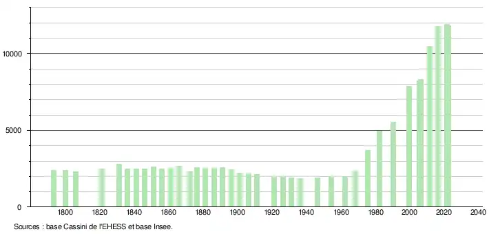 - ↑ Par convention dans Wikipédia, le principe a été retenu de n’afficher dans le tableau des recensements et le graphique, pour les populations de référence postérieures à 1999, que les populations correspondant à une enquête exhaustive de recensement pour les communes de moins de 10 000 habitants, et que les populations des années 2006, 2011, 2016, etc. pour les communes de plus de 10 000 habitants, ainsi que la dernière population de référence publiée par l’Insee pour l'ensemble des communes.