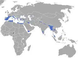 Cette espèce est répandue du Sud de l'Europe et de l'Afrique du Nord, à travers certaines parties du Proche-Orient et de la péninsule arabique, et de l'Asie centrale, de l'Asie du Sud et de l'Asie du Sud-Est continentale, jusqu'à l'île de Bornéo à l'Est. En Europe, il est confiné à la zone climatique méditerranéenne, présent sur les péninsules ibériques, italiennes et balkaniques ainsi que sur un certain nombre d'îles méditerranéennes. Il existe une population introduite établie dans les îles Canaries. En Afrique du Nord, il est présent au Maroc, en Algérie, en Tunisie, en Libye et en Egypte. En Méditerranée orientale, il est présent sur l'île de Chypre et répartie dans certaines parties de la Turquie, de la Syrie, du Liban, d'Israël et de la Jordanie. Dans le Caucase, on le retrouve en Azerbaïdjan, en Géorgie et peut-être en Arménie.