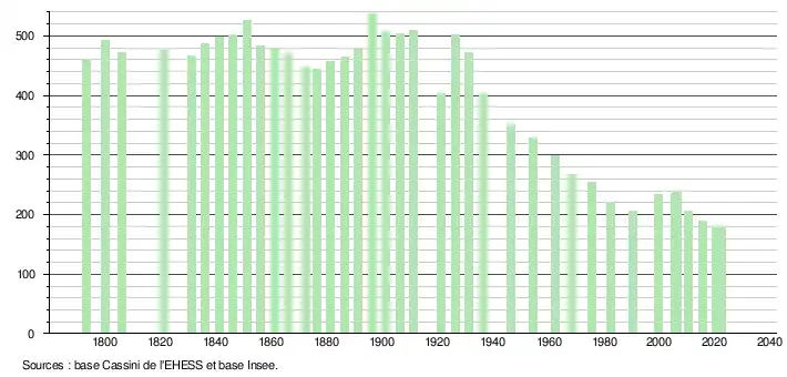 L'évolution du nombre d'habitants est connue à travers les recensements de la population effectués dans la commune depuis 1793. Pour les communes de moins de 10 000 habitants, une enquête de recensement portant sur toute la population est réalisée tous les cinq ans, les populations de référence des années intermédiaires étant quant à elles estimées par interpolation ou extrapolation[16]. Pour la commune, le premier recensement exhaustif entrant dans le cadre du nouveau dispositif a été réalisé en 2005[17].