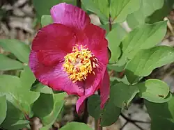 La floraison a lieu de mai à juin[5]. Les fleurs solitaires, terminales, de 9 à 14 cm vont du rouge au rose. Les pétales sont largement ovales. Les nombreuses étamines portent des anthères plus longues que les filets. Les fleurs sont pollinisées par les insectes.