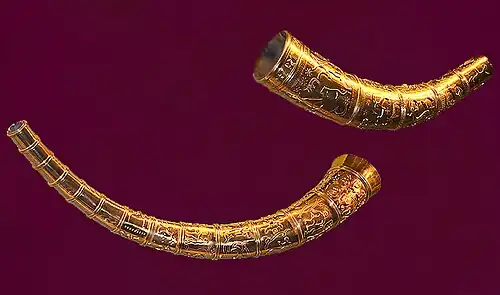 Lors de la transition entre l'âge du bronze et l'âge du fer (environ 500 avant J.-C.), les coutumes vivantes et religieuses évoluent[51]. Au lieu d'enterrer leurs morts, on commence à les brûler avant de les mettre en terre de manière cérémonieuse[51]. Cette pratique funéraire est restée dominante jusqu'à la transition vers le christianisme au Moyen Âge. Dans des sources plus tardives, il semble que les peuples germaniques croyaient que les morts continueraient à vivre dans un royaume céleste grâce à l'incinération, tandis que ceux qui étaient déposés dans la terre sans être brûlés y resteraient[52]. Les objets d'origine celtique dominent, et les motifs mythologiques trouvés dans de nombreux cas ont des liens évidents avec la région méditerranéenne ou la culture celtique. Selon l'historien Malcolm Todd, il est presque impossible de distinguer les premiers Germains des Celtes en se basant uniquement sur les preuves archéologiques[53]. Bien qu'il y ait peu d'informations disponibles sur la mythologie germanique du début de l'âge du fer, les vestiges indiquent qu'il y a eu des changements dans les croyances religieuses des peuples germaniques au cours des siècles[54].