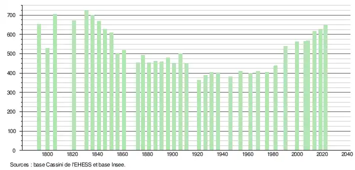 L'évolution du nombre d'habitants est connue à travers les recensements de la population effectués dans la commune depuis 1793. Pour les communes de moins de 10 000 habitants, une enquête de recensement portant sur toute la population est réalisée tous les cinq ans, les populations de référence des années intermédiaires étant quant à elles estimées par interpolation ou extrapolation[25]. Pour la commune, le premier recensement exhaustif entrant dans le cadre du nouveau dispositif a été réalisé en 2008[26].