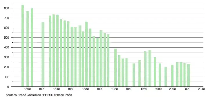 L'évolution du nombre d'habitants est connue à travers les recensements de la population effectués dans la commune depuis 1793. Pour les communes de moins de 10 000 habitants, une enquête de recensement portant sur toute la population est réalisée tous les cinq ans, les populations de référence des années intermédiaires étant quant à elles estimées par interpolation ou extrapolation[20]. Pour la commune, le premier recensement exhaustif entrant dans le cadre du nouveau dispositif a été réalisé en 2006[21].
