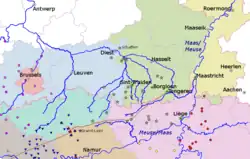 - Le 17 janvier 966, une charte de l'abbaye de Saint-Trond indique que la propriété de Rudolf à Gelmen (entre Saint-Trond et Borgloon) a été confisquée et se trouve désormais entre les mains de la collégiale de Maria dans la capitale impériale d'Aix-la-Chapelle. Elle se trouvait dans le comté de Garnier de Valenciennes dans le pagus de la Hesbaye[25]. Ce Rudolf, comme le voisin mentionné ci-dessus, n'est pas qualifié de comte.