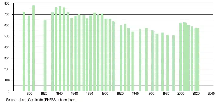L'évolution du nombre d'habitants est connue à travers les recensements de la population effectués dans la commune depuis 1793. Pour les communes de moins de 10 000 habitants, une enquête de recensement portant sur toute la population est réalisée tous les cinq ans, les populations de référence des années intermédiaires étant quant à elles estimées par interpolation ou extrapolation[28]. Pour la commune, le premier recensement exhaustif entrant dans le cadre du nouveau dispositif a été réalisé en 2004[29].