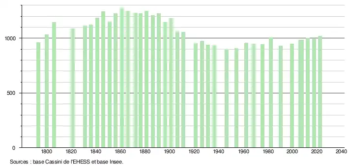 L'évolution du nombre d'habitants est connue à travers les recensements de la population effectués dans la commune depuis 1793. Pour les communes de moins de 10 000 habitants, une enquête de recensement portant sur toute la population est réalisée tous les cinq ans, les populations de référence des années intermédiaires étant quant à elles estimées par interpolation ou extrapolation[29]. Pour la commune, le premier recensement exhaustif entrant dans le cadre du nouveau dispositif a été réalisé en 2007[30].