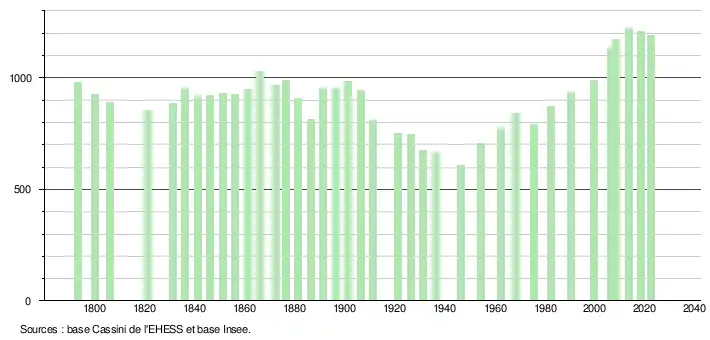 | L'évolution du nombre d'habitants est connue à travers les recensements de la population effectués dans la commune depuis 1793. Pour les communes de moins de 10 000 habitants, une enquête de recensement portant sur toute la population est réalisée tous les cinq ans, les populations de référence des années intermédiaires étant quant à elles estimées par interpolation ou extrapolation[26]. Pour la commune, le premier recensement exhaustif entrant dans le cadre du nouveau dispositif a été réalisé en 2008[27]. En 2022, la commune comptait 1 192 habitants[Note 5], en évolution de −2,05 % par rapport à 2016 (Gironde : +6,91 %, France hors Mayotte : +2,11 %). |