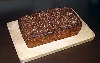 Danemark: le rugbrød est un pain parallélépipédique, confectionné au seigle (dont le tiers de grains entiers), ensemencé au levain, additionné de babeurre.