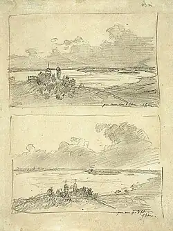 À la galerie Tretiakov sont conservées deux esquisses graphiques du tableau Paix éternelle. Les dessins datés de 1893 portent le nom d'Avant l'orage et sont réalisés au crayon graphite sur une feuille de papier (dimensions 18 × 16 cm, à l'inventaire sous no 5689)[64],[65]. Le dessin placé au-dessus (dans ce texte de l'article) est considéré comme le premier et celui en-dessous comme le deuxième. Selon la critique d'art Faïna Maltseva, ces esquisses hâtives « ne sont même pas encore des croquis mais seulement une première idée qui contient en elle le germe d'un futur tableau ». Levitan montre l'émotion qui surgit dans la nature à l'approche de l'orage. Le dessin du bas est réalisé depuis un point de vue plus élevé que celui du haut, et c'est pourquoi les espaces aquatiques du lac semblent plus grands. Dans ces dessins on devine la hâte de l'artiste qui se manifeste par un trait inégal et irrégulier dans les contours des sujets représentés[66]. selon E. Bialynitski-Biroulia, (veuve du peintre Vitold Bialynitski-Biroulia), ces esquisses représentent le lac Ostrovno et ses îles ainsi que l'église de la Trinité sur la berge[67].