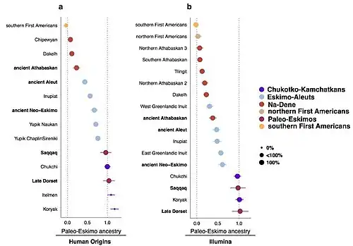 - ↑ D'autres recherches, publiées en 2017, ont conduit une équipe de chercheurs à confirmer une origine est-sibérienne du peuple de Saqqaq et à mettre en évidence qu'il possédait un patrimoine génétique commun avec les anciennes populations aléoutiennes, mais également avec le peuple Athabaskan[25].