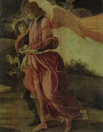 En bas de la composition, en dimensions réduites et inhabituelles se trouve l'archange Raphaël accompagnant Tobie, qui tient à la main le traditionnel poisson que l'ange lui a fait pêcher afin de sauver son père malade Tobias. L'archange est invoqué comme saint protecteur de l'arte dei Medici e degli Speziali.