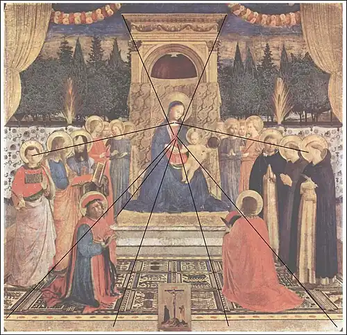 - Usage d'une ligne de fuite verticale[3] car les deux lignes de regard des deux groupes de saints protecteurs convergent, elles, plutôt vers son cou (à supposer que les saints ont la même taille, le point de fuite n'est alors plus le même que le précédent du tapis et du dais).