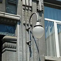 Ces fenêtres quadripartites sont soulignées d'une rangée d'oculi et surmontée d'une frise de denticules portée par de remarquables cariatides stylisées[1] de style Art nouveau géométrique.