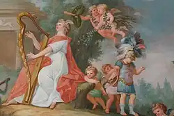 - Salle Chinoise : de plan carré avec un pavement en bois, présentant 5 puits. Sur les murs, il y a des peintures de style néoclassique représentant des figures féminines dans des grands festins avec des oiseaux et divers objets.