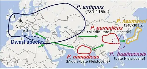 - Palaeoloxodon naumanni Makiyama, 1924 : 300 sites de l'archipel japonais, Chine