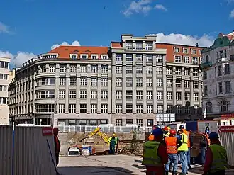 La construction est achevée vers 1926 mais le bâtiment est modifié jusque dans les années 1930, principalement en remodelant l'angle des rues Jungmannova et Charvátova où une concession automobile est construite[3].