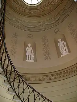 L'étage noble étant placé dans le socle en bossage[2], les invités y descendent depuis l'entrée principale située sur la rue par un escalier monumental bénéficiant d'un puits de lumière au décor peint et muni de niches pourvues de cinq statues de divinités antiques parmi lesquelles Mercure, Asclépios et Bacchus.