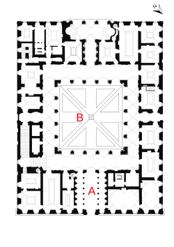 Le programme des salles de représentation au premier étage sont le faste et la vie luxueuse. Un large escalier d'honneur voûté (12) mène de l'angle est du cortile à l'étage noble.