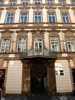 La façade principale sur la rue Celetna est composée d'un portail du Haut Baroque avec une paire d'Atlantes de chaque côté, portant un balcon avec balustrade classique.
