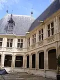 Façade intérieure du Palais Jacques-Cœur et tour d'escalier principal avec ses allèges décorées. Cette façade sur cour est plus décorée que la façade sur rue, ce qui est inhabituel pour l'architecture urbaine de l'époque[1]. | ||||